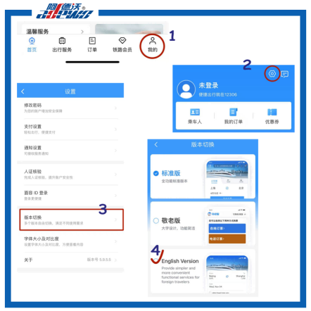 12306 பயன்பாட்டைப் பதிவிறக்கி, "Me(கீழே) → "Settings" → "Switch Version" → ஆங்கிலப் பதிப்பிற்கு மாறுவதற்கு ஆங்கிலத்தைத் தேர்ந்தெடுக்கவும்.